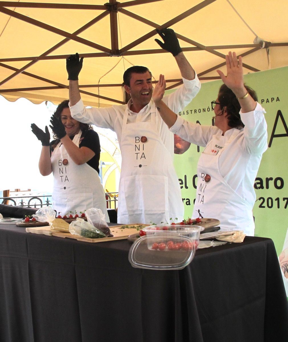En la plaza de San Agustín de Los Realejos, con el ambiente festivo en honor a Nuestra Señora del Carmen y a las puertas de la VI Muestra Gastronómica de la Papa Bonita que acoge la localidad este sábado 22 de julio, en la mañana de este viernes 21 la ganadora del show talent televiso de cocina Top Chef 2017, Rakel Cernicharo, presentó para toda España, mostrándolo por vez primera ante los medios de comunicación y el público en general, su primer libro de recetas. Estuvo acompañada por el alcalde de Los Realejos, Manuel Domínguez, y la concejala de Turismo de la localidad, Carolina Toste, con quienes elaboró un delicioso desayuno de ‘Trampantojo de cereza de queso’, una de las creaciones incluidas en su libro.